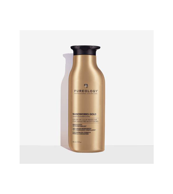 “Pureology Nanoworks Gold Shampoo renews softness, manageability, and shine to dull, coarse, brittle, or very dry color-treated hair with key ingredients Keravis and Golden Marula Oil and a signature aromatherapy blend of Dewy Pear, Ylang Ylang, and Golden Amber.